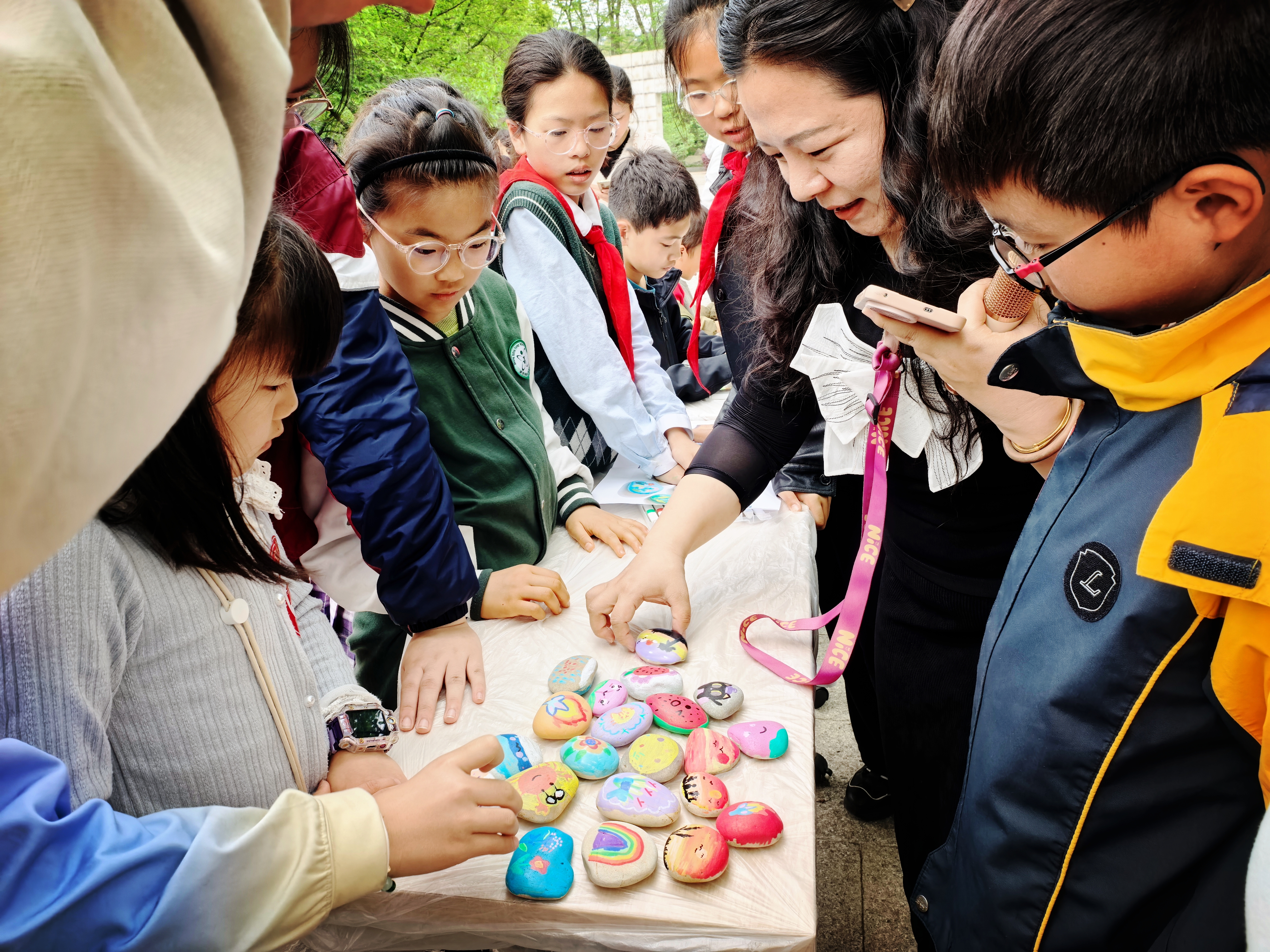 在主会场天降花雨广场,中心自主研发的“慧眼识矿”矿物识别系统首次公开亮相,公众扫码即可通过 AI 技术识别矿物标本,感受“人工智能 + 地质科普”的创新魅力,近百名儿童在专业老师指导下开展石上绘画,在创作中感悟自然与艺术融合之美。在分会场盆景园设置陶艺体验区,参与者亲手触摸泥土、感受大地质感。雨花石博物馆内,讲解员将英烈事迹、地质知识与生态理念融会贯通,让科普更有温度、更有深度。